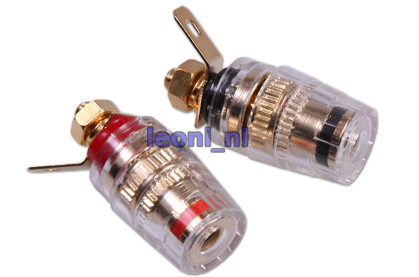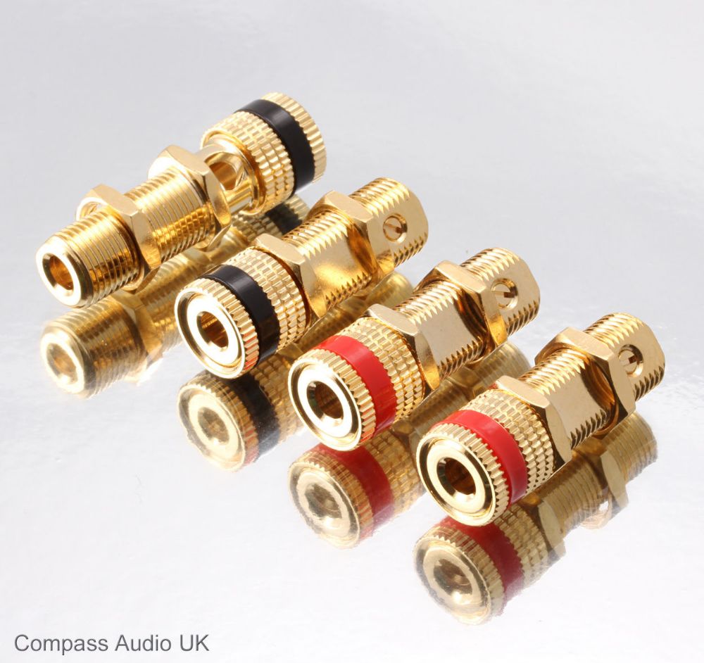 Proper speaker binding terminals, no geeky screw-in stuff, but practical 4mm banana plugs