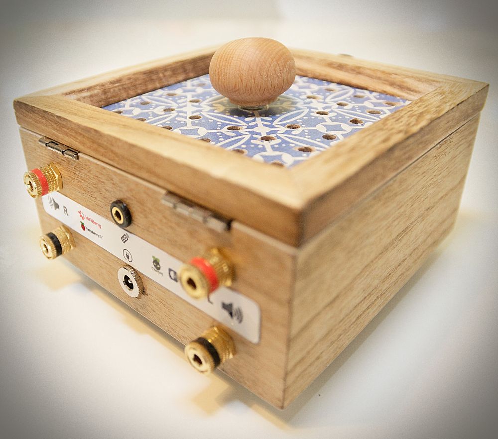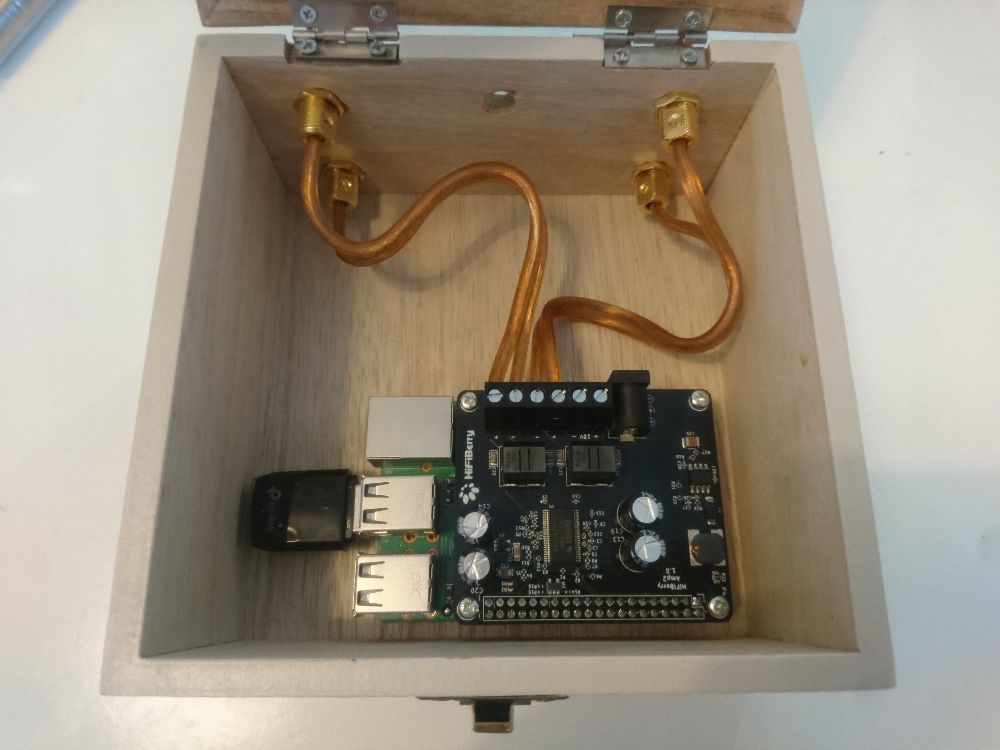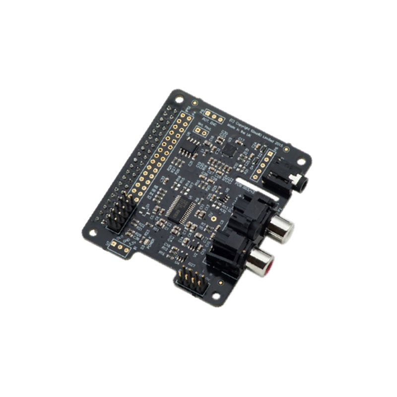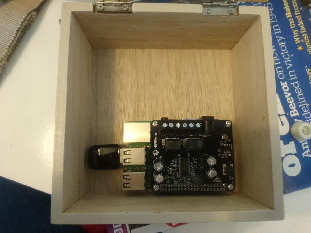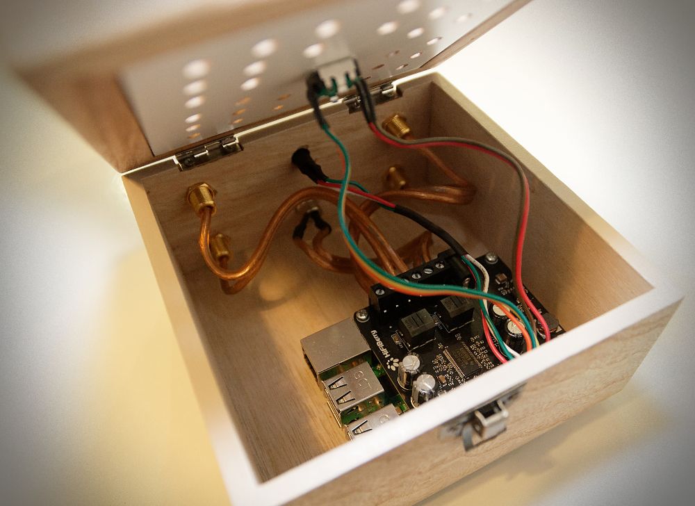 a HifiBerry AMP2 IQaudIO (now Raspberry Pi) DigiAMP+ add-on board, a 24 bit, 192 kHz capable PCM DAC with a 35 W class D amplifier