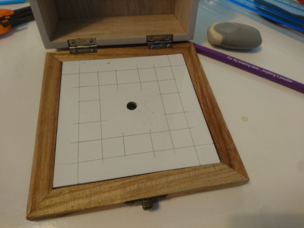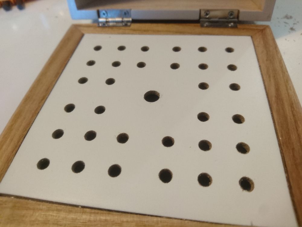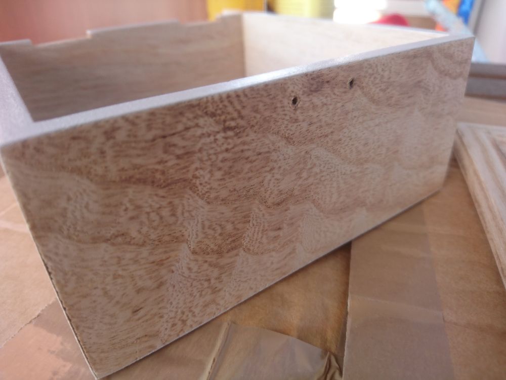Standoffs and screws ready for mounting on the thin bottom board of the box, followed by four 2.5 mm holes: