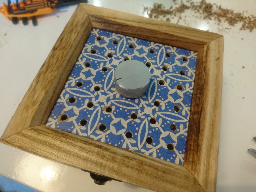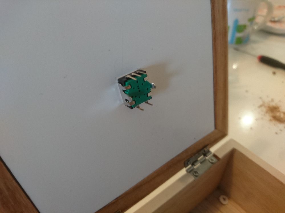 The rotary encoder is mounted on the top plate, dead center. The box is deep enough, there will be no pin in close proximity with the Raspberry Pi below.