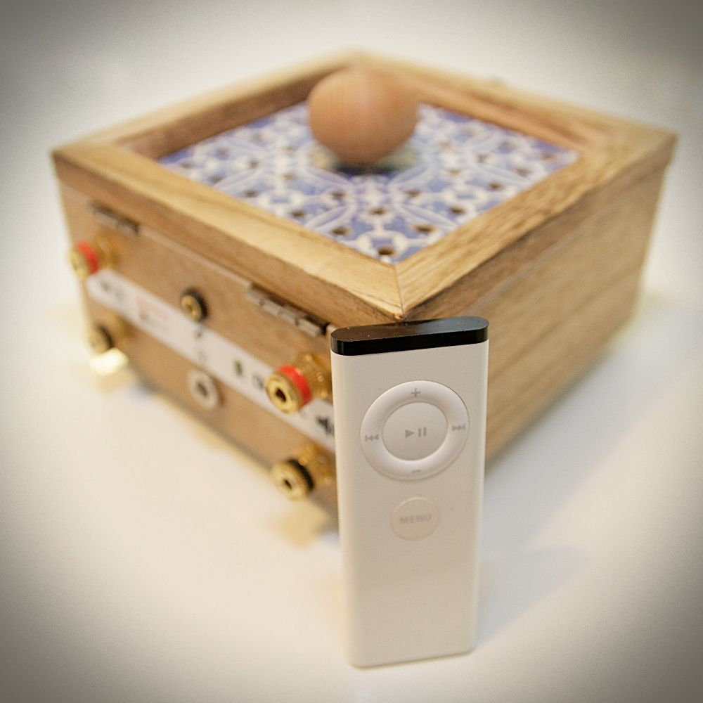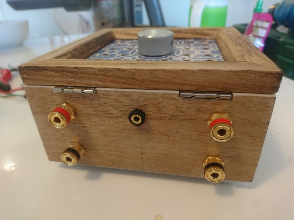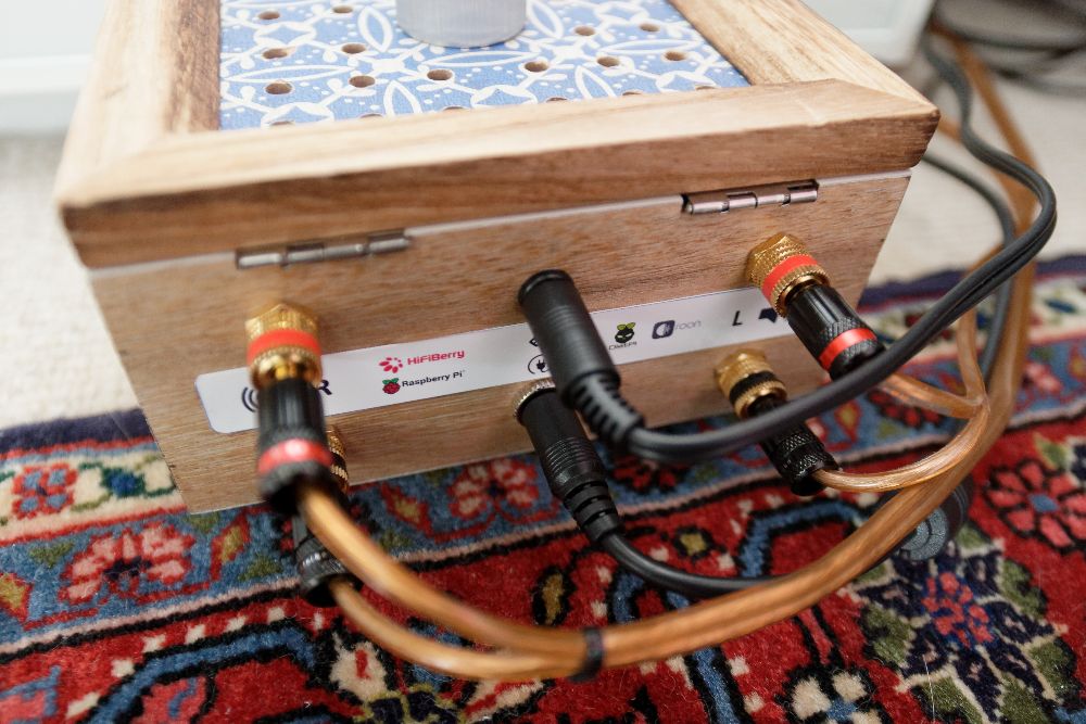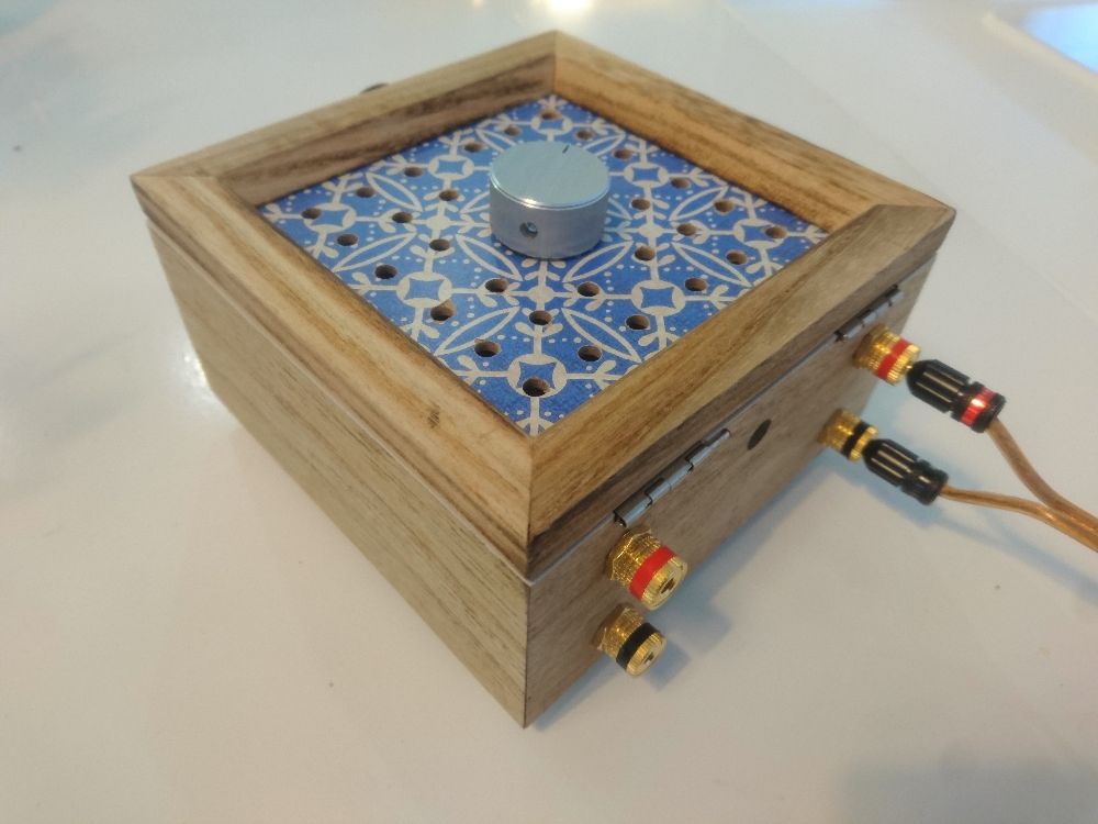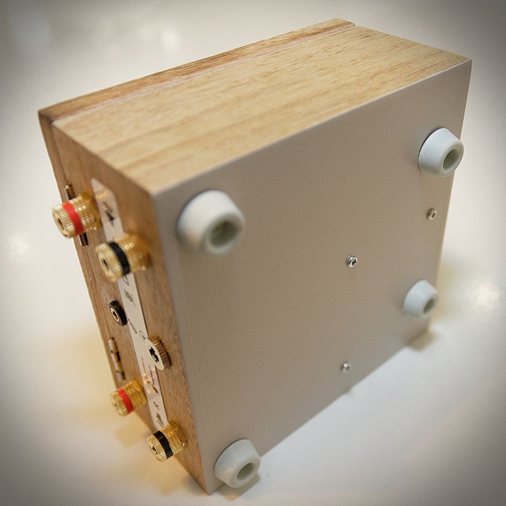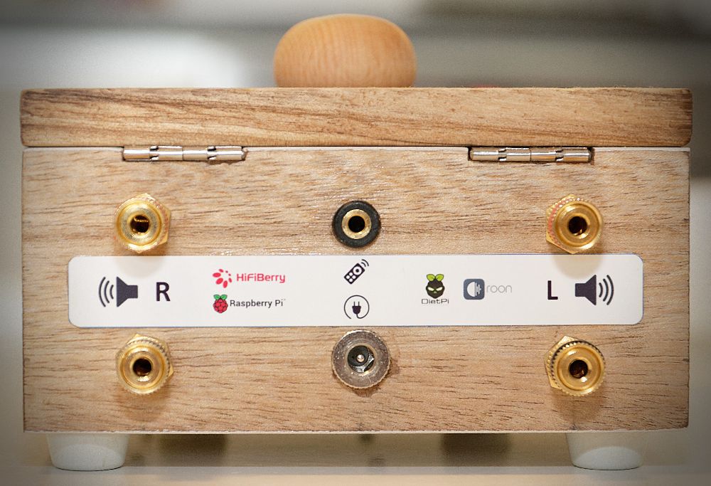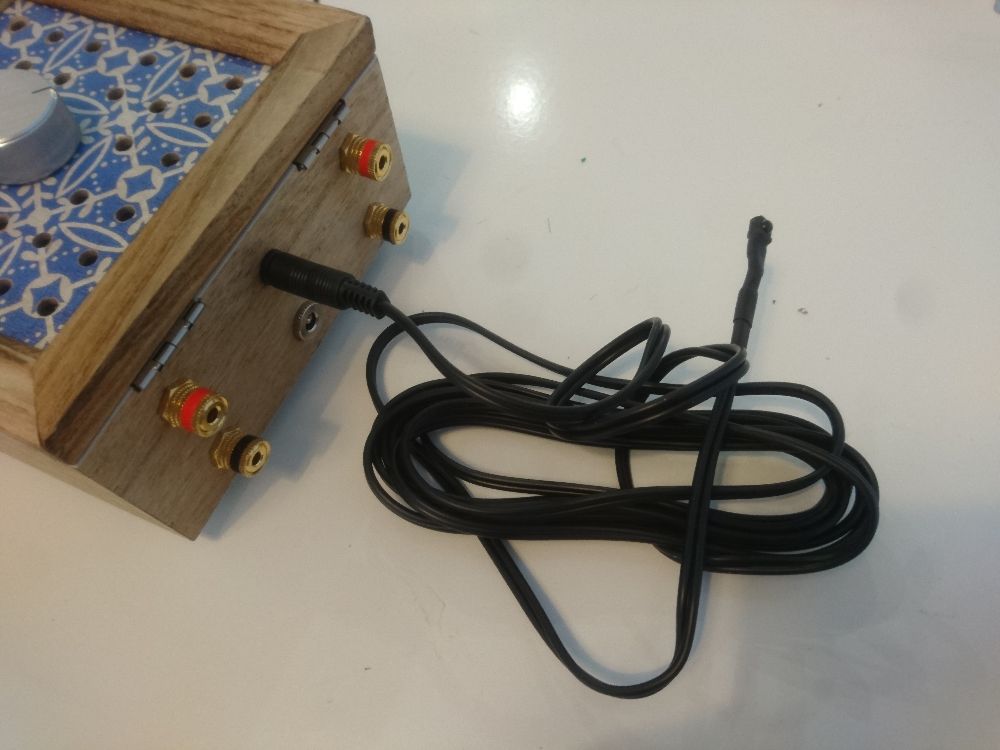 This is a simple female 2.1 mm barrel socket, screwed into the wood. Not much to say here. It uses the screwed binding posts of the amplifier.